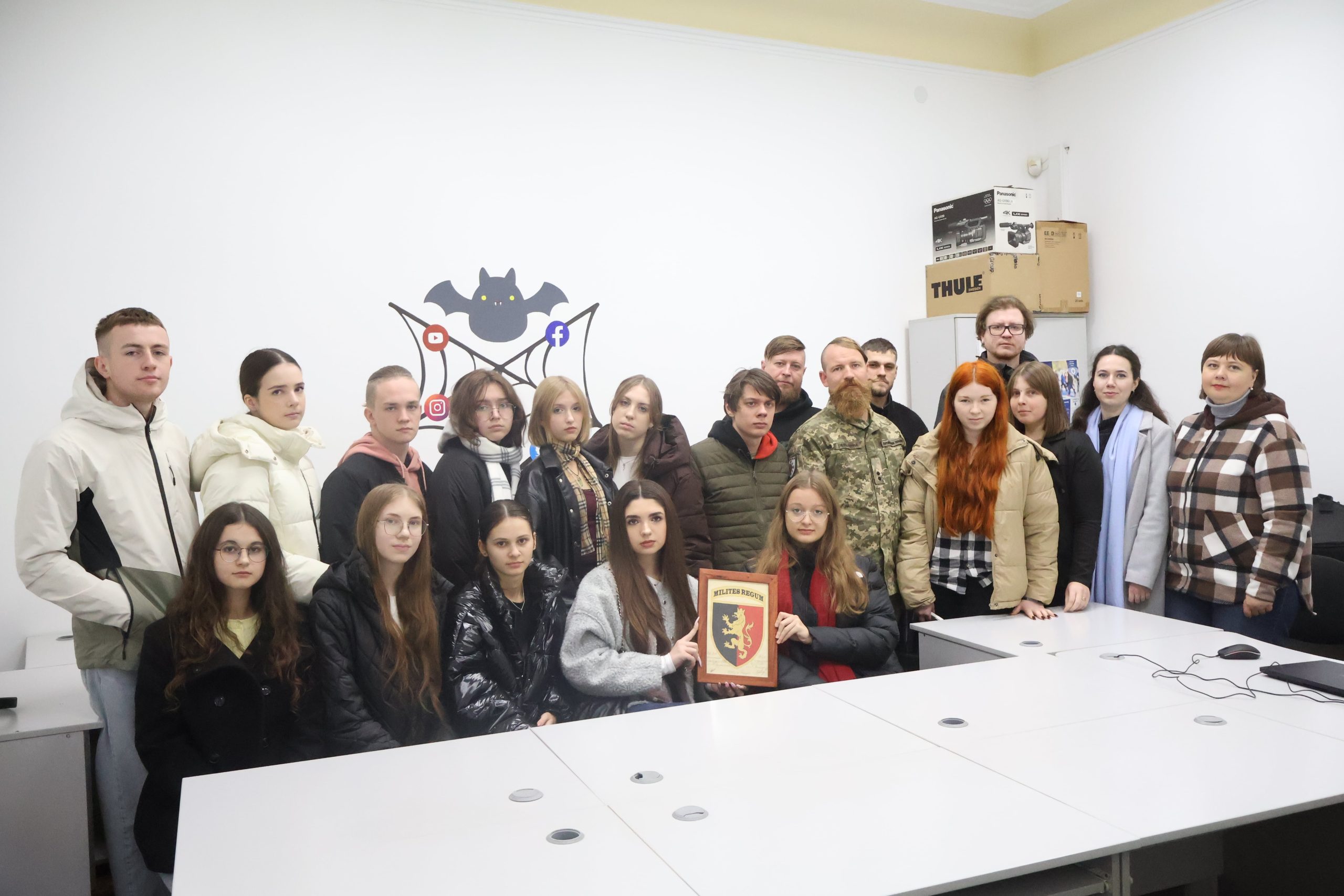 На початку презентації документальної стрічки до студентів та викладачів звернувся Іван Петричак – пресофіцер 24-ї окремої механізованої бригади імені короля Данила, автор проєкту та режисер.