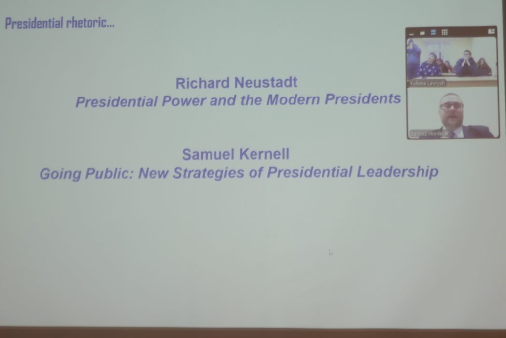 Основна частина лекції була присвячена аналізу комунікаційних стратегій чинного президента Польщі Кароля Навроцького. Щоб забезпечити розуміння контексту, професор коротко окреслив особливості польської політичної системи — парламентсько-кабінетну республіку з елементами напівпрезидентської моделі. Президент має важливі, але обмежені повноваження: право вето, затвердження послів, командування Збройними силами. Бартош Гордецький звернув увагу на те, що президент Польщі Кароль Навроцький активно використовує публічну присутність як політичний ресурс, намагаючись розширити межі своїх впливів через комунікацію. Таку стратегію американський політолог Семюел Кернелл називає «going public» — «вихід до публіки», коли політик звертається безпосередньо до громадян, минаючи офіційні інституційні канали. Серед проаналізованих прикладів — інавгураційна промова, виступ 15 серпня, інтерв’ю для провідних медіа, а також промова під час відкриття Музею Варшавської битви 1920 року.